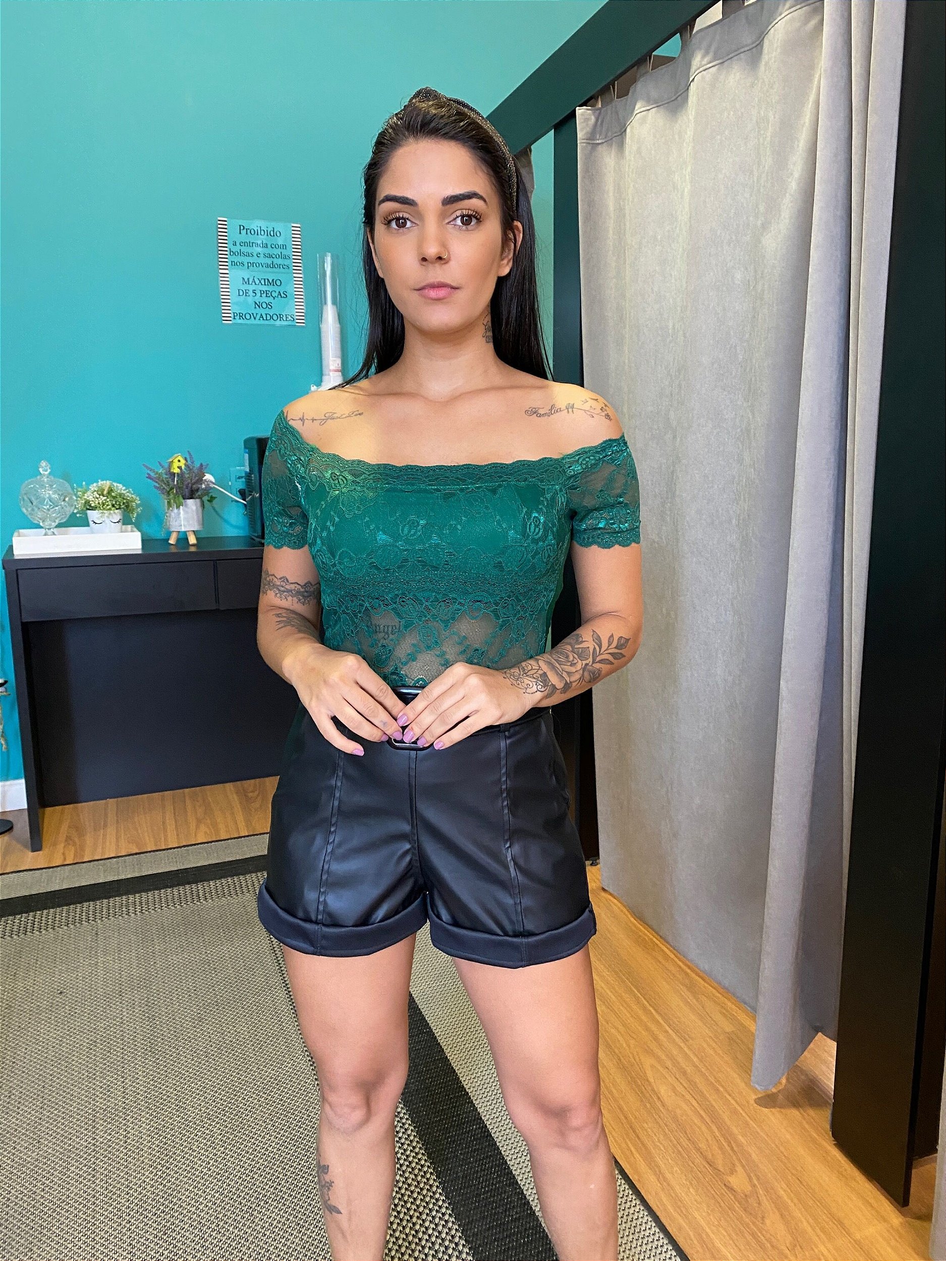 O poliester com Elastano nada mais é do que a conhecidíssima Lycra no tecido. Aquela elasticidade agradável e que veste bem ao corpo. Essa elasticidade além de gerar muito conforto, faz com que as suas roupas durem muito mais, já que as fibras não se quebram como as naturais. Ele já possui bojo, é todo rendado com leve detalhe transparente e poder ser compostos por vários looks, como jaquetas, blazer etc.. Uma peça curinga que você precisa ter no guarda roupa.